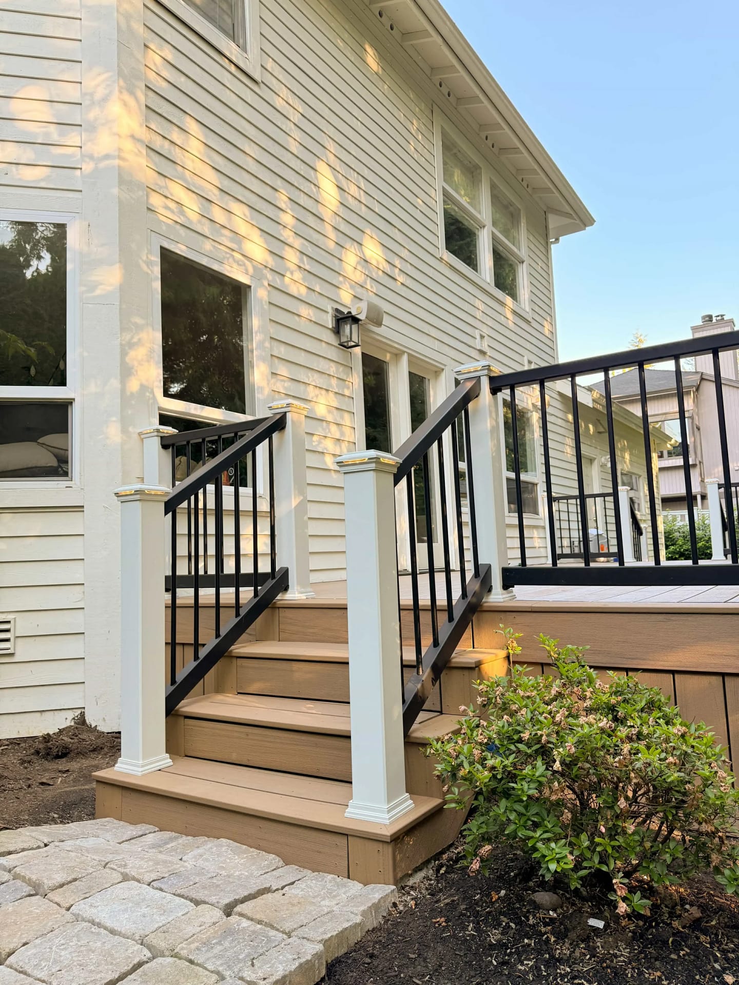 This deck renovation project in Kirkland transformed an aging wood deck into a modern outdoor retreat. We replaced the old surface with durable Trex Composite boards, added new steps, installed sleek metal railings, and integrated energy-efficient post lighting — creating a beautiful and low-maintenance outdoor space.