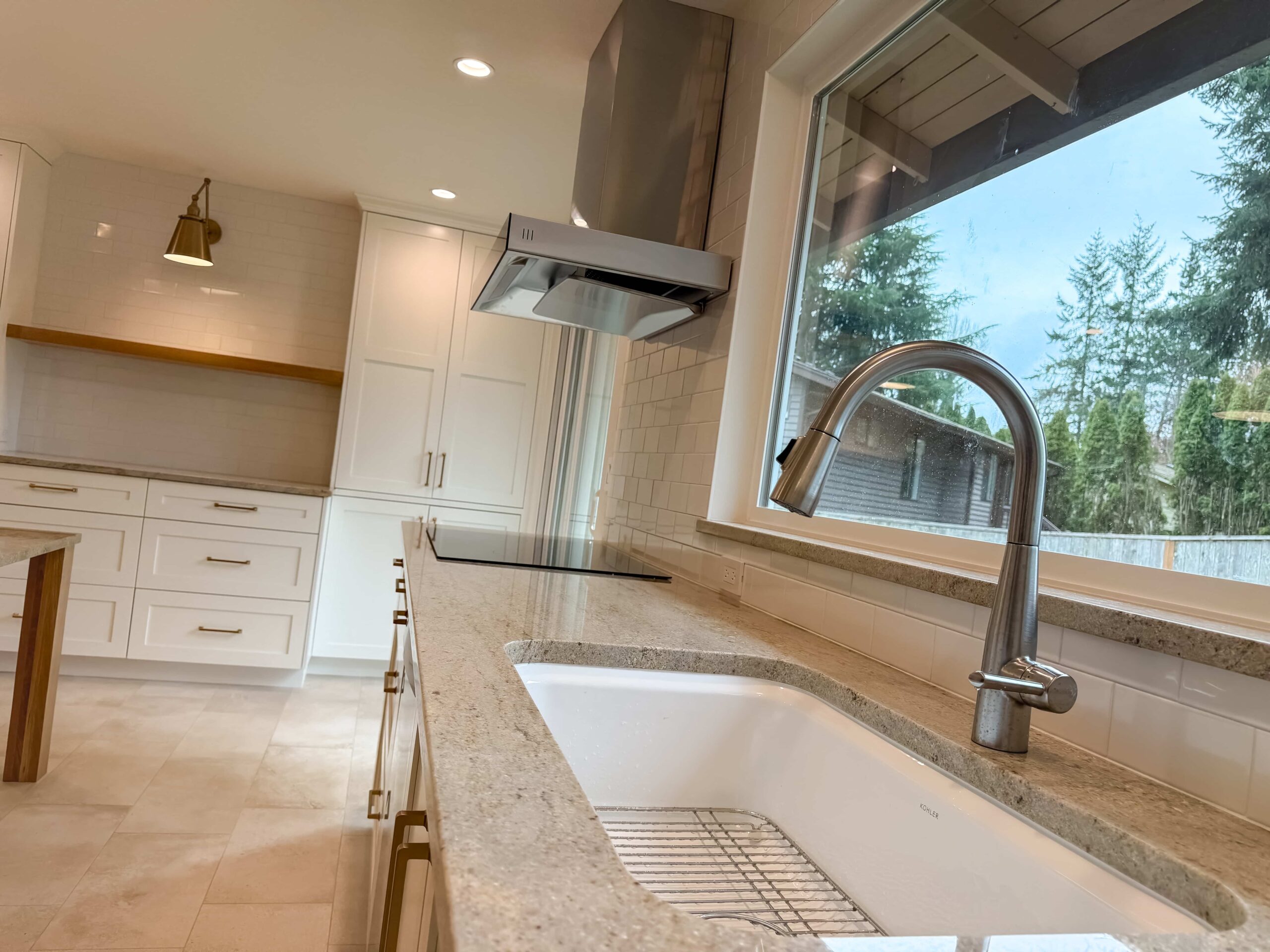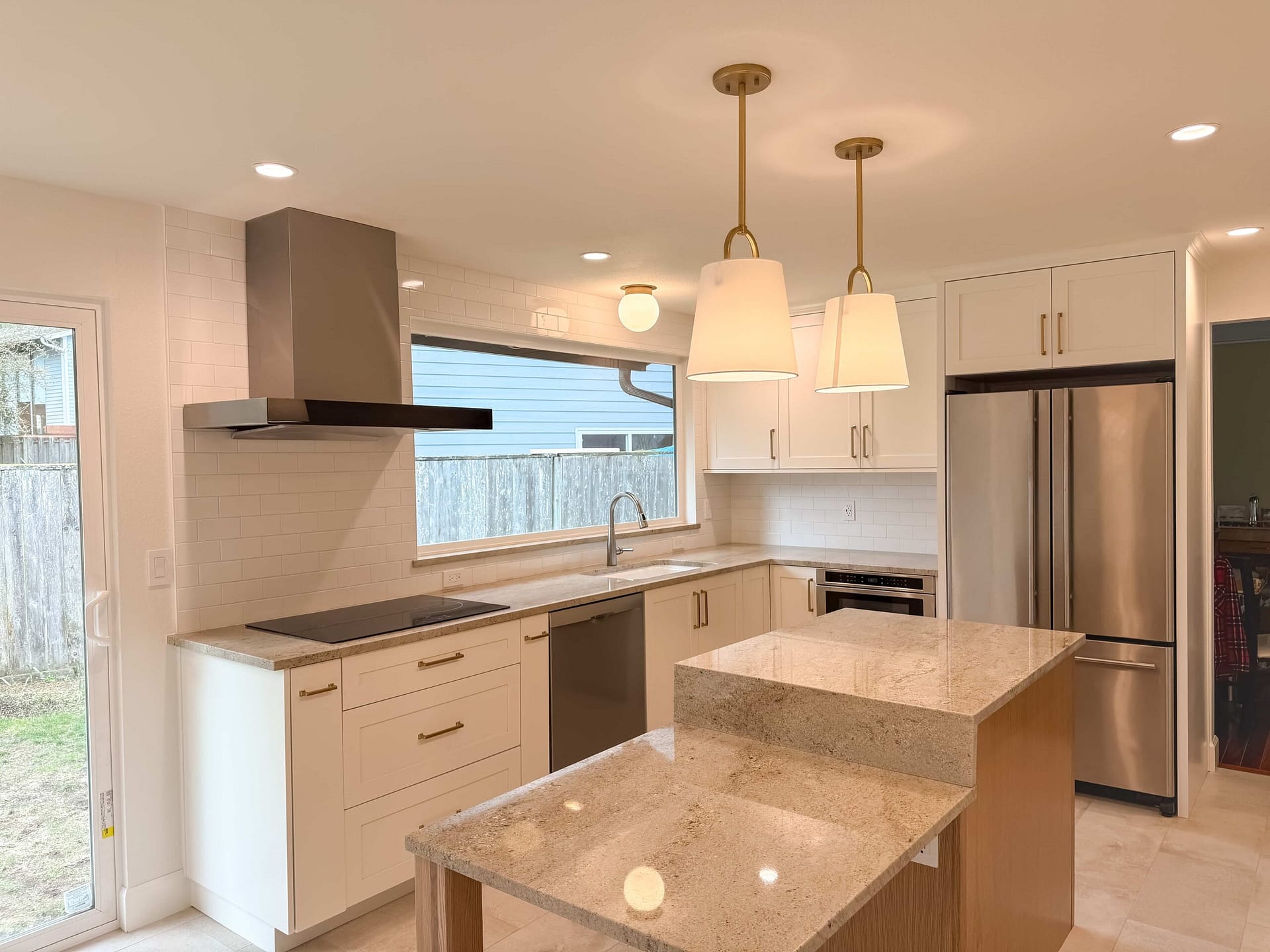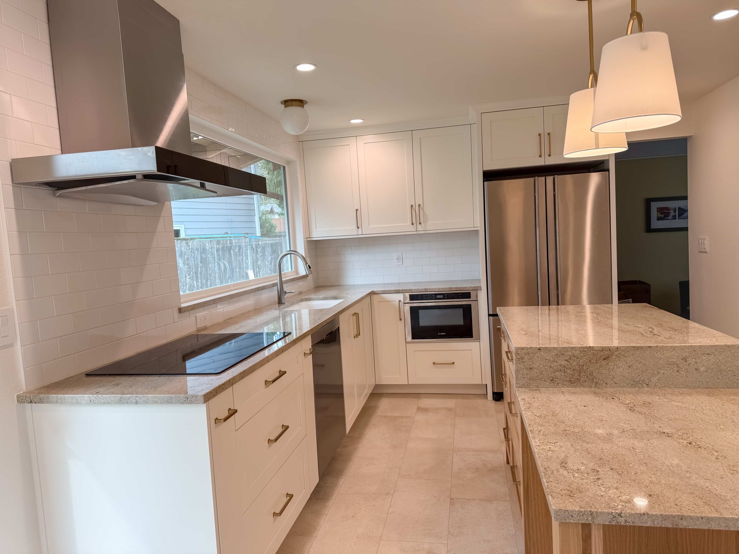 This full kitchen renovation in Redmond completely transformed an outdated space into a modern, functional, and bright kitchen. We handled every stage of the remodel – from demolition and drywall to custom cabinetry, plumbing adjustments, tile flooring, painting, countertops, backsplash, and appliance installation – creating a space that perfectly blends design and practicality.