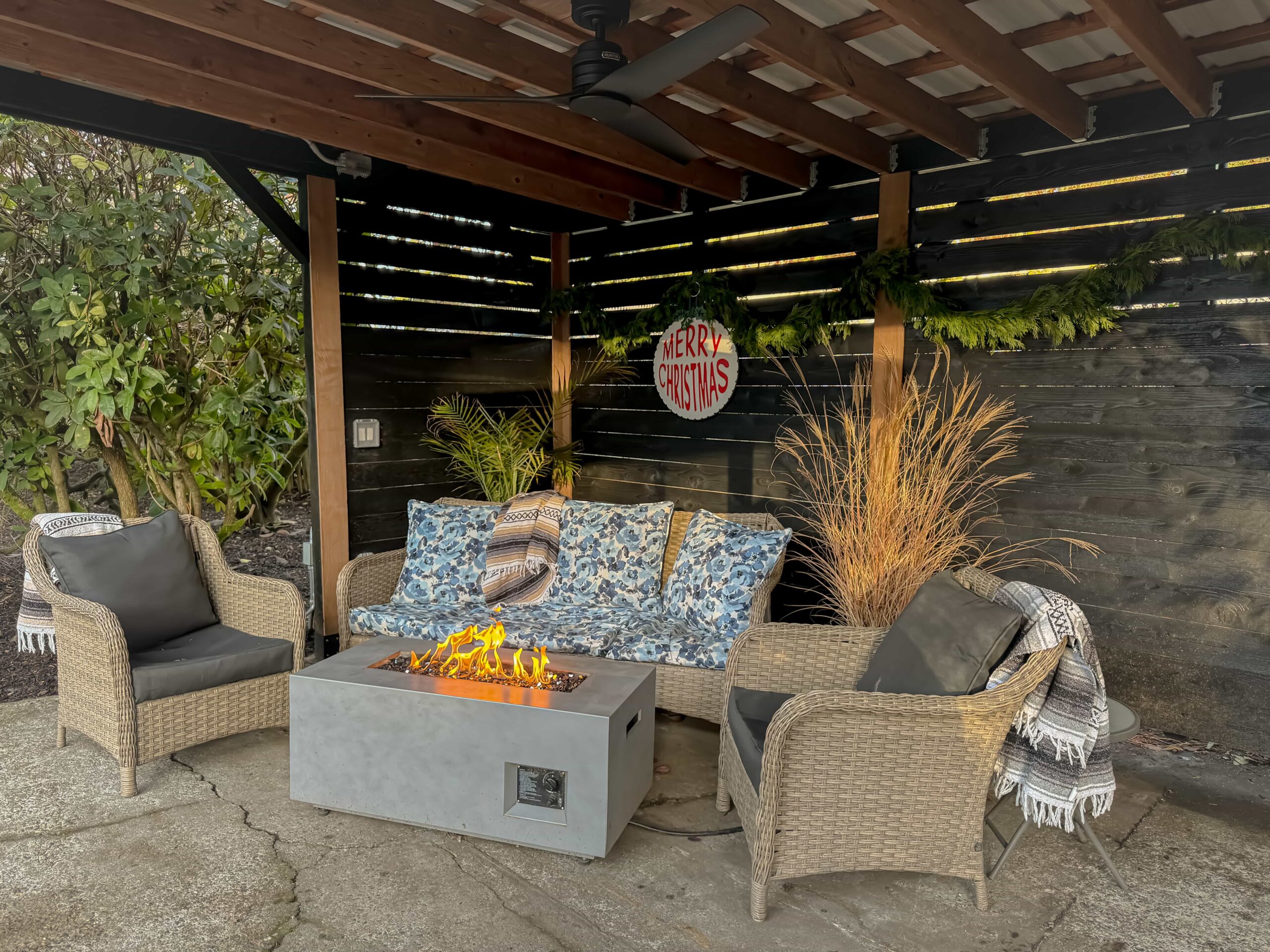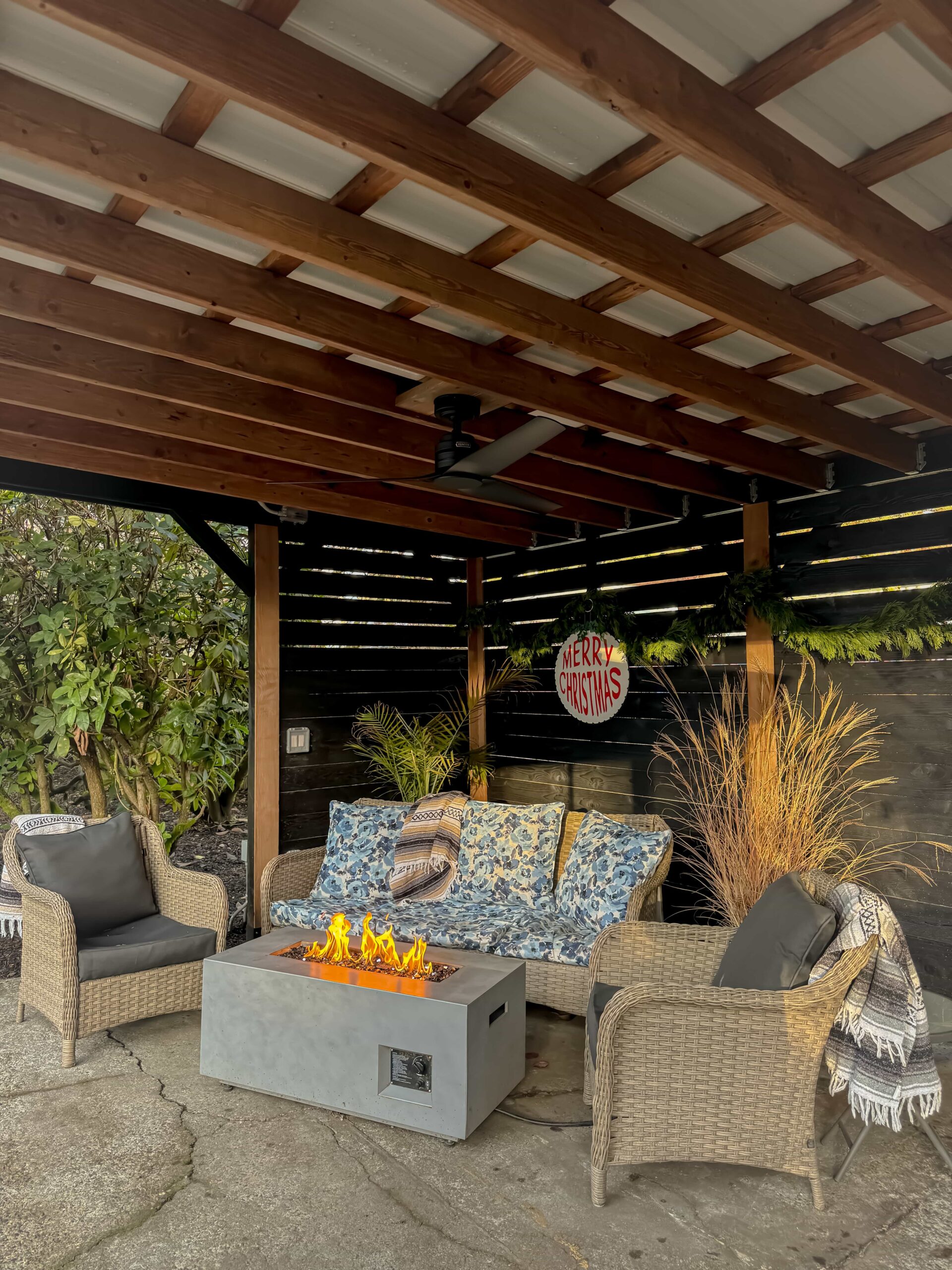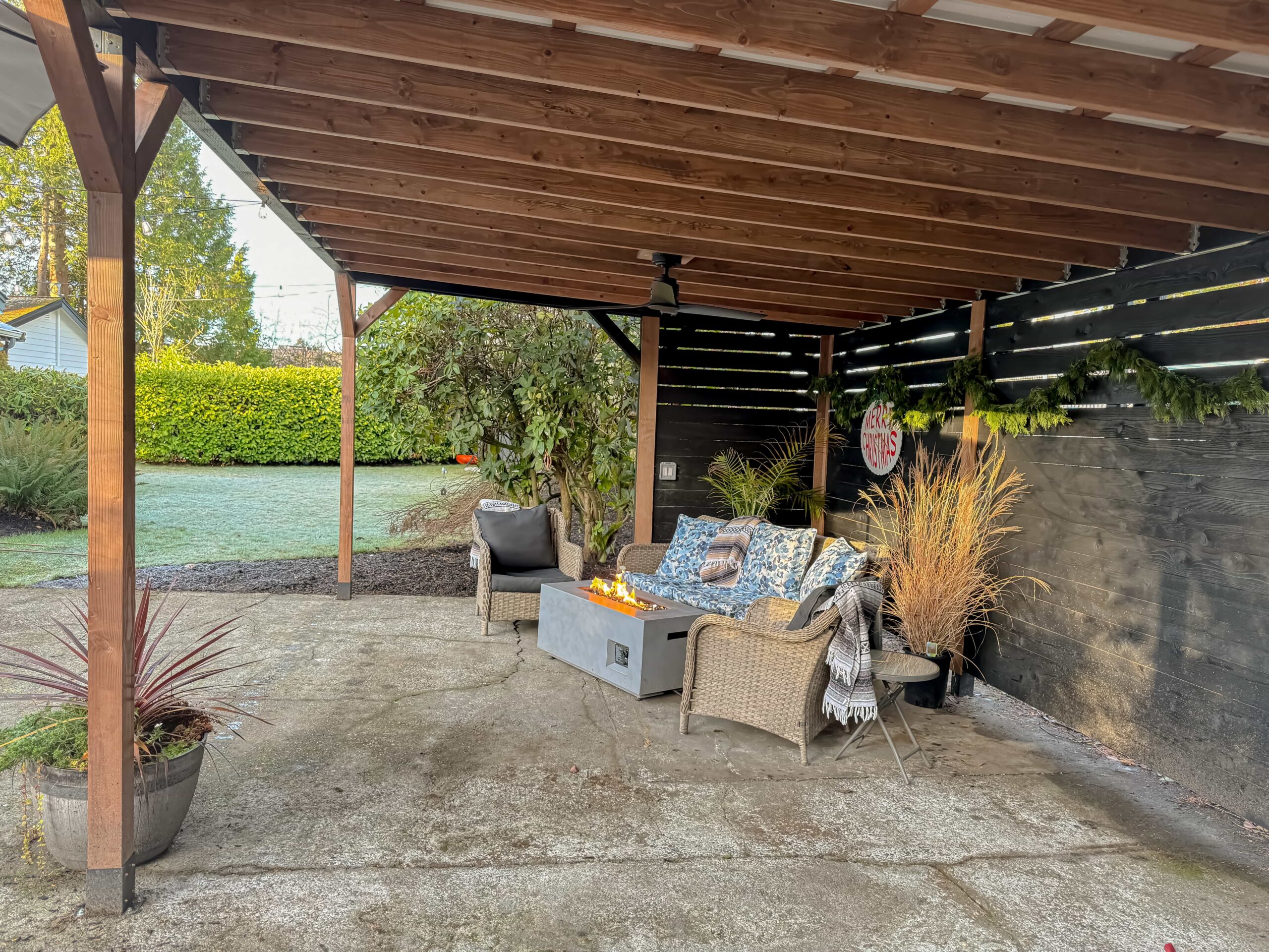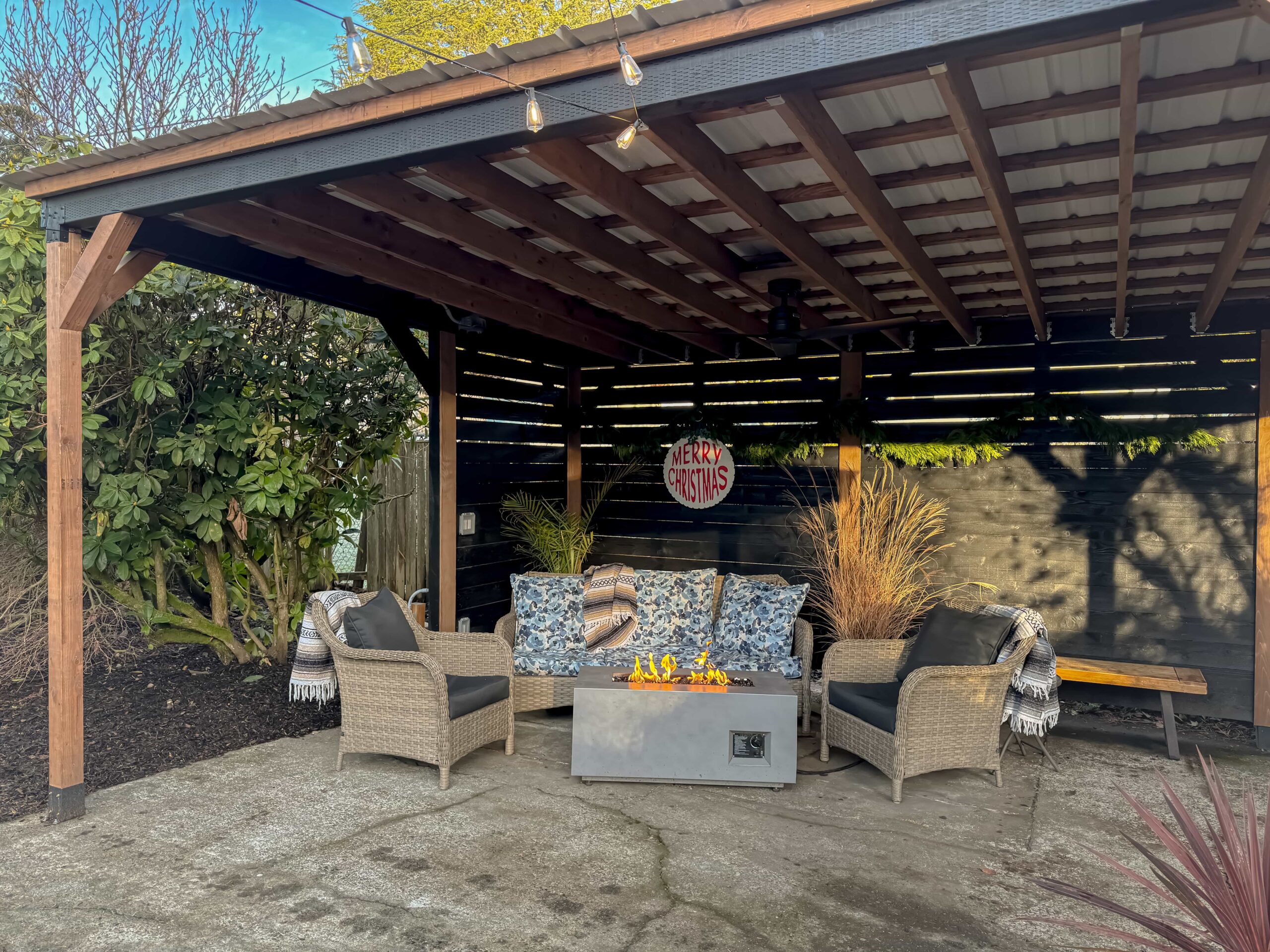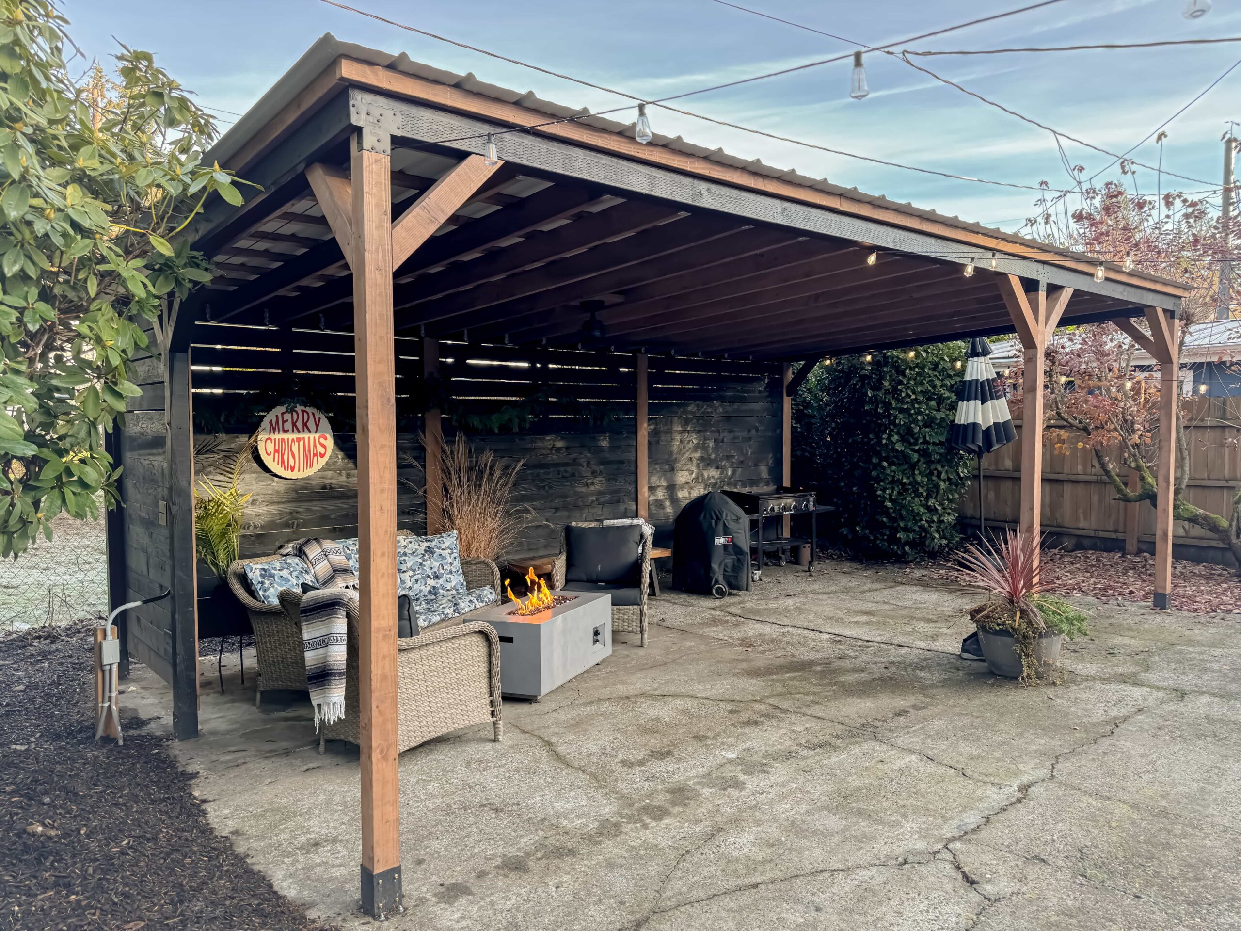 We completely replaced an old, deteriorating patio in Seattle, WA, transforming it into a stylish and modern outdoor space. The new patio features a solid structure with 4×4 posts securely attached to concrete, a sturdy framed roof and back wall for privacy, beautiful cedar wood planks, and a sleek metal roof. The wood elements were stained and painted to create a balanced contrast between natural and modern tones. The project was finished with a ceiling fan and power outlet to make the area both functional and comfortable for daily enjoyment.
