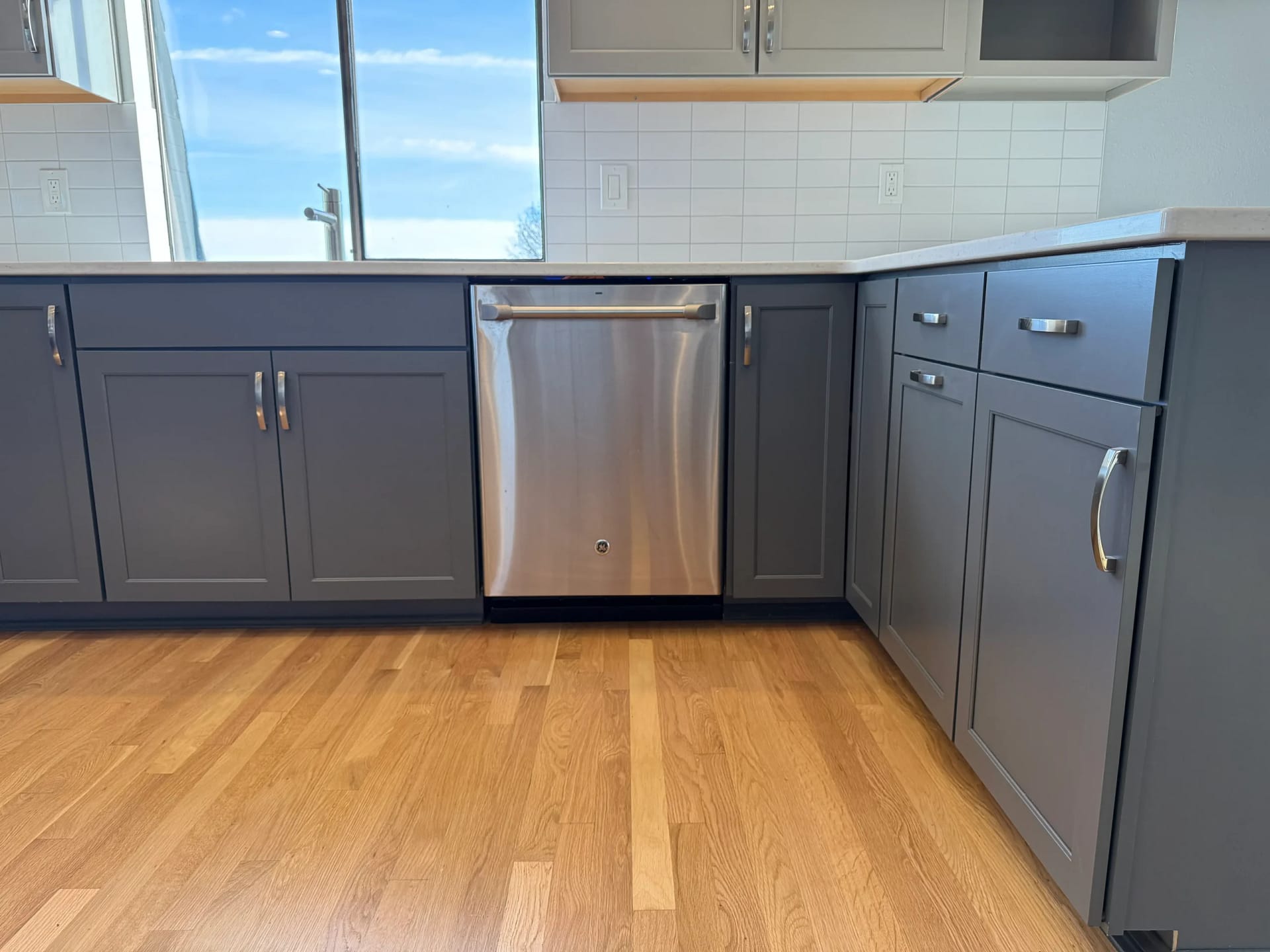 Installed classic 3×6 subway tiles for the backsplash, using platinum grout to subtly blend the tones of the cabinets and walls.